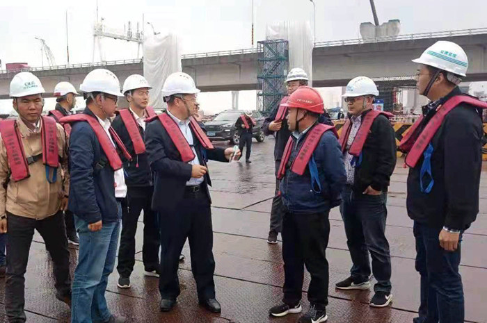 下午1點(diǎn)半,葉楠在該公司常務(wù)副總經(jīng)理?xiàng)罟?、副總?jīng)理?xiàng)畛砂病⒈O(jiān)理公司總監(jiān)章華鋒陪同下,來(lái)到濱?;ネ⒔滑F(xiàn)場(chǎng),首先聽(tīng)取了公司副總工程師兼杭甬項(xiàng)目負(fù)責(zé)人黃偉關(guān)于工程項(xiàng)目施工進(jìn)展、隊(duì)伍和設(shè)備管理、安全質(zhì)量、環(huán)保及鋼箱梁生產(chǎn)制作等方面的情況介紹。然后查看棧橋防護(hù)欄、救生圈、攀爬和下行橋墩及承臺(tái)的梯階、消防器材、配電箱、電纜線,以及高空和臨水作業(yè)人員的保險(xiǎn)繩、破樁頭防護(hù)等情況。查看了鋼護(hù)筒打插、鉆孔泥漿反循環(huán)作業(yè),混凝土泵車罐樁、承臺(tái)立模、綁扎鋼筋籠、完工的墩柱等。對(duì)濱?;ネㄊ┕みM(jìn)度、質(zhì)量、安全及環(huán)保等情況很滿意。他說(shuō):“中鐵十五局是個(gè)講誠(chéng)信的單位,管理很規(guī)范,都是按照合同要求去做的。”他針對(duì)冬季大風(fēng)天氣多、天冷、工期、質(zhì)量、安全等因素提出四點(diǎn)要求:一是做好防大風(fēng)、防寒工作,遇到大風(fēng)天氣,特別是夜間施工,一定要注意,出現(xiàn)8級(jí)以上大風(fēng),反應(yīng)要迅速,必須停止施工,人員要撤離到安全地帶。冬天溫度低,電焊工盡量避免夜間臨水、高空作業(yè)。二是繼續(xù)抓好樁基、承臺(tái)、墩身各工序的質(zhì)量管理,嚴(yán)格把好質(zhì)量關(guān),不要出現(xiàn)任何質(zhì)量隱患。三是要調(diào)動(dòng)一切力量,加快濱海高架、濱?;ネê瓦B續(xù)梁施工進(jìn)度,不能耽誤明年架梁進(jìn)程。四是加強(qiáng)海上施工環(huán)保工作,避免破樁頭的混凝土塊掉進(jìn)海里,保持棧橋、平臺(tái)清潔衛(wèi)生,展現(xiàn)央企的好作風(fēng)、好形象。