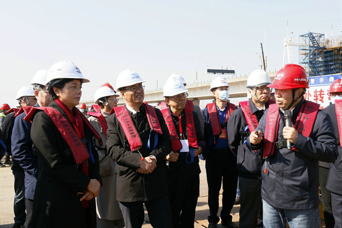 上午10點,余紅藝一行50多人乘3輛中巴到達位于濱?;ネ⒔荒蟼?cè)的施工現(xiàn)場,在一塊10米長的巨幅宣傳牌前,聽取寧波市交通局副局長樊獻鵬關于杭甬項目情況匯報。樊獻鵬手握話筒一會兒指著制作的兩張高速公路網(wǎng)圖和濱?;ネㄈ皥D,一會兒面向各位領導,就杭甬復線寧波一期高速公路建設,對改善杭州灣區(qū)域路網(wǎng)結(jié)構(gòu)、推進環(huán)杭州灣區(qū)建設、打造寧波舟山港集疏運網(wǎng)絡北向主要貨運通道、加強寧波舟山港集疏運能力、促進長三角一體化和沿海經(jīng)濟社會高質(zhì)量發(fā)展具有重要意義等作了詳細介紹。然后,他將杭甬項目濱?;ネㄖ攸c作了介紹。他說,中鐵十五局承建的濱?;ネㄕ己C娣e613畝,保守地說是亞洲最大的海上互通立交,據(jù)查證,目前世界上還沒有比濱?;ネǜ蟮暮I狭⒔?,施工難度大,技術含量高,安全風險大。這個項目前期因為多種原因,進度有點滯后,現(xiàn)在趕上來了,按期完成建設任務沒問題。隨后,余紅藝一行在F匝道查看了樁基施工情況。她指出,濱?;ネㄊ钦憬『蛯幉ㄊ械闹攸c建設項目,百年大計,質(zhì)量必須要保證。安全也要注意,冬天來了,氣溫大幅下降,高空和夜間作業(yè),大風天氣要做好安全防護工作,確保施工人員安全。