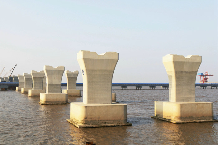 濱海高架橋主線(xiàn)長(zhǎng)6900米,上部結(jié)構(gòu)采用8孔40米+77孔50米預(yù)制架設(shè)箱梁+77.5+135+77.5連續(xù)梁。下部結(jié)構(gòu)為鉆孔樁+承臺(tái)+花瓶墩,橋梁跨越擬建和在建的排污管道、原油管道、給水通道、取水盾構(gòu)隧道、LNG管線(xiàn)和通信光纜。為滿(mǎn)足施工需要,濱海高架橋設(shè)計(jì)高6米、長(zhǎng)6900米、寬8米的棧橋,棧橋是施工必不可少的附屬工程,沒(méi)有棧橋的存在,便無(wú)法完成各項(xiàng)施工任務(wù)。棧橋是租賃一家單位的,每平米1天的租金是23.7元,僅高架橋的棧橋,每天的租金高達(dá)163530元。為便于樁基、底板、承臺(tái)、墩身24小時(shí)作業(yè),濱海高架橋還架設(shè)了上百座作業(yè)平臺(tái)。隨著濱海高架橋主體施工進(jìn)入后期階段,作業(yè)平臺(tái)和大部分鋼棧橋的使命已經(jīng)完成,今年以來(lái)陸續(xù)將上百座平臺(tái)拆除,拆除濱海高架橋棧橋也勢(shì)在必行。