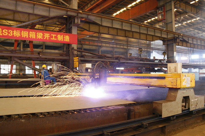 互通區(qū)匝道橋梁均采用鋼-混凝土組合梁。組合梁為槽口型結(jié)構(gòu),頂板寬0.6米、0.8米,底板寬2.1米、2.6米和3.1米,鋼梁高有1.2米(20米跨徑)、1.4米(25-31米跨徑)、1.7米(40米、42米跨徑)、1.9米(45米跨徑)和 2.1米多道豎向加勁肋,不同厚度的頂板、底板、腹板對接,頂板、底板頂面對齊,腹板中心對齊。每個組合梁均為單室截面,鋼箱之間采用工字型鋼橫梁聯(lián)系,橫梁與鋼梁內(nèi)橫隔板對應(yīng)設(shè)置,鋼梁頂板上焊接抗剪用的圓柱頭剪力釘。鋼箱梁是S3標(biāo)施工的重難點(diǎn)。