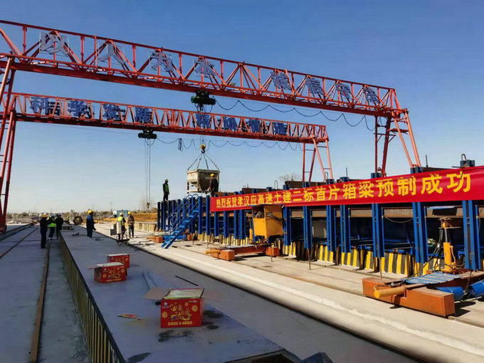 由中鐵二十一局三公司孝漢應(yīng)項目部承建的2標(biāo)段,全部為橋梁工程,4座橋梁累計總長2.529公里。其中老府河特大橋主橋設(shè)計為(90+160+90)米連續(xù)箱梁,是孝漢應(yīng)項目全線控制性工程。標(biāo)段內(nèi)樁基444根,25米預(yù)制箱梁870片。項目總投資3.3億,建設(shè)工期720天。制梁場長度440米,占地面積為15840平方米。