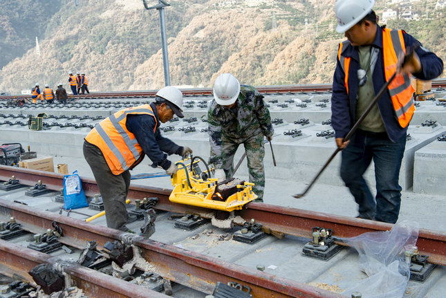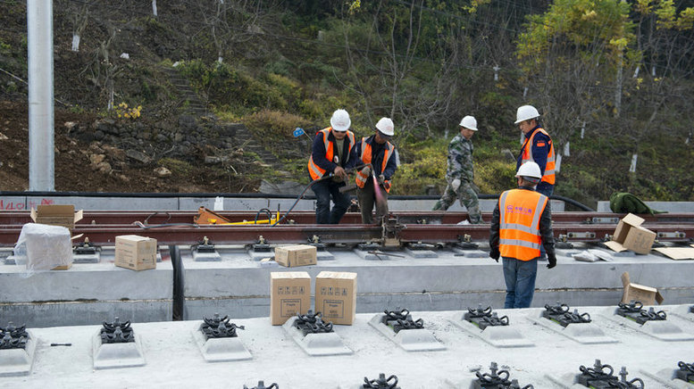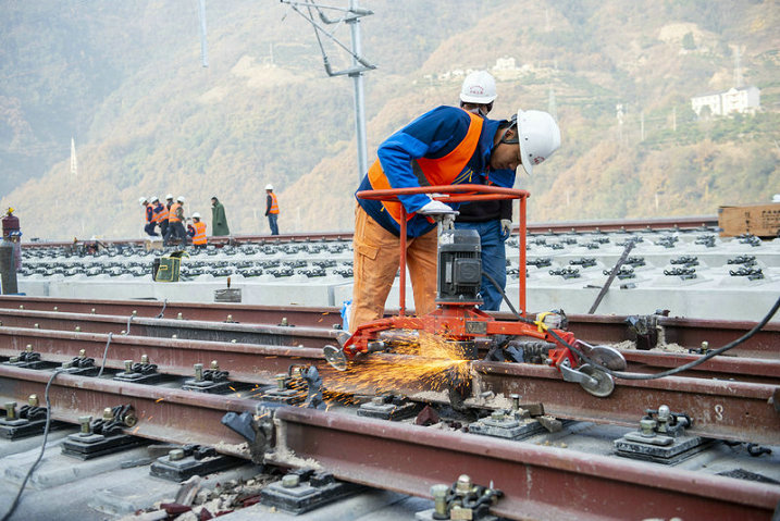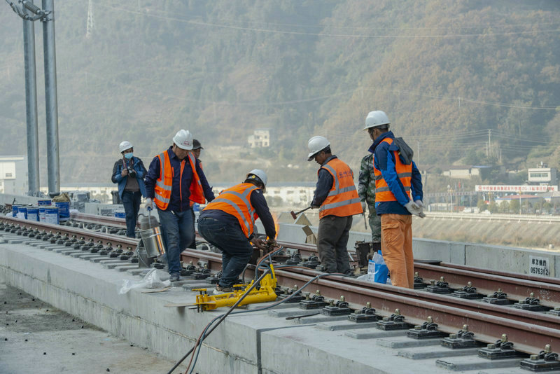 鄭萬高鐵鐵路鋼軌無縫焊接施工正在有序推進(jìn)-興山車站鋁熱焊施工人員作業(yè)中