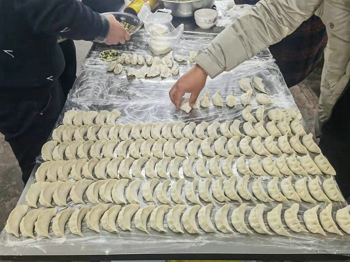 下午5點(diǎn),項(xiàng)目部職工食堂內(nèi)人頭攢動(dòng)、暖意融融,當(dāng)做飯的阿姨拿出早就準(zhǔn)備好的餃子皮,以及韭菜、白菜、雞蛋和豬肉等各類原料后,職工們便熱情洋溢地參與其中。大家三三兩兩一組,分工協(xié)作,有的剁餃子餡,有的包餃子,也有的做起了學(xué)徒,虛心的向身邊“餃子高手”請(qǐng)教,研習(xí)制作技巧,忙得不亦樂乎。經(jīng)過近2個(gè)小時(shí)的連續(xù)“奮戰(zhàn)”,操作臺(tái)上的餃子一字排開,花樣繁多、式樣各異,展示出項(xiàng)目部職工齊心協(xié)力的勞動(dòng)成果。