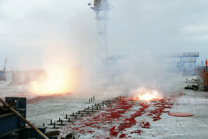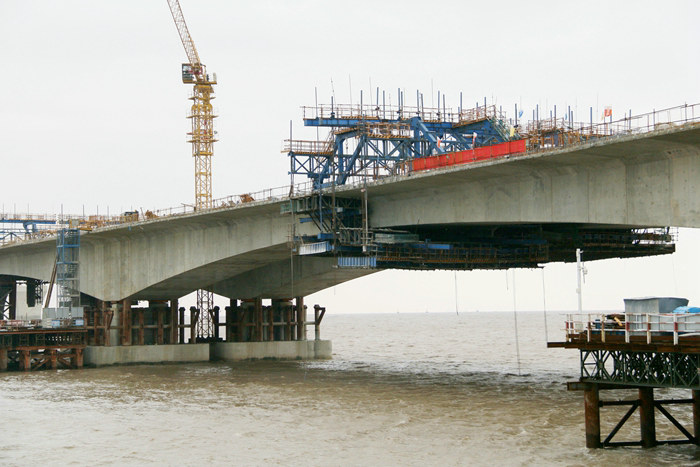 杭甬項(xiàng)目濱海高架橋懸空連續(xù)梁主跨135米,兩端副跨各77.5米,全長290米,橫跨海底直徑4.5米的輸油管道,是濱海高架橋的節(jié)點(diǎn),也是全線的重難點(diǎn)工程。橋梁起點(diǎn)樁號為K35+240,終點(diǎn)樁號為K35+530,施工難度大、安全風(fēng)險(xiǎn)高,在施工過程中,若鋼模等重物在吊運(yùn)過程中,不慎從吊鉤上脫落,由幾十米高空墜海砸中輸油管道,必然會(huì)造成管壁破裂,原油外泄,使海水出現(xiàn)嚴(yán)重污染,后果不堪設(shè)想,不敢有絲毫馬虎,要時(shí)刻蹦緊安全之弦。出于安全考慮,該項(xiàng)目部請寧波市海事局蛙人摸排原油管道并標(biāo)出準(zhǔn)確位置,在棧橋和連續(xù)梁施工中避免誤踩“雷區(qū)”。同時(shí)組織技術(shù)人員熟悉圖紙、反復(fù)調(diào)研論證復(fù)雜的海底地質(zhì),掌握詳實(shí)、精確的第一手資料,再由工程部專人編寫施工方案。有關(guān)人員不分白晝加班加點(diǎn)奮戰(zhàn)數(shù)日,長達(dá)169頁的《濱海高架橋連續(xù)梁施工方案》初稿出籠,然后召集“智囊團(tuán)”成員討論、修改方案,后經(jīng)專家組審定,正式組織實(shí)施。