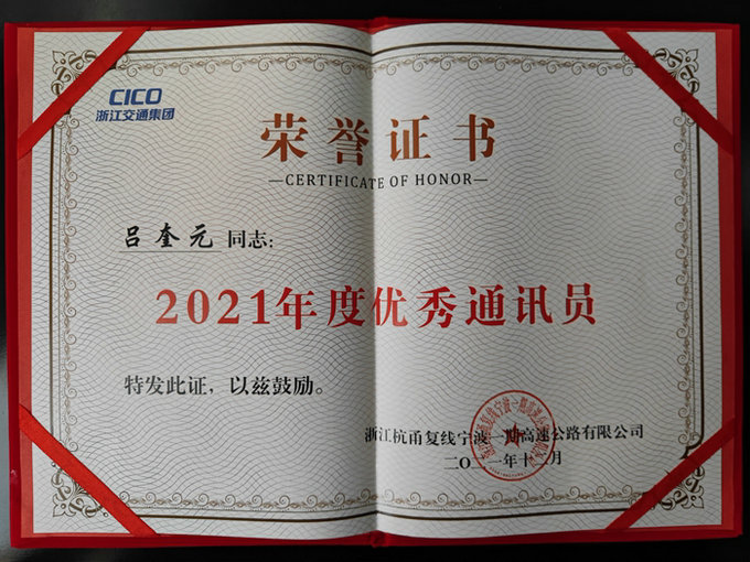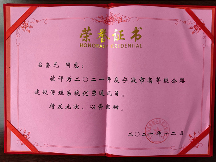 寧波市高等級公路建設管理中心在全市高速公路建設領域開展評選2021年度優(yōu)秀通訊員活動,此次共評選出21名優(yōu)秀通訊員,呂奎元是杭甬復線一期5個標段唯一獲獎的個人。由業(yè)主組織評選的杭甬復線2021年度信息宣傳工作先進集體和優(yōu)秀通訊員,共有3個集體和10名個人獲獎。他熱愛新聞宣傳工作,采寫新聞的過程中,將多年積累的知識、情感、經(jīng)驗全部釋放出來。他經(jīng)常深入施工現(xiàn)場拍照、與施工人員交流,采寫出許多有深度、含金量高的新聞,2021年在浙江日報、寧波日報、股份公司網(wǎng)站等多家媒體發(fā)表消息、通訊1100余篇。