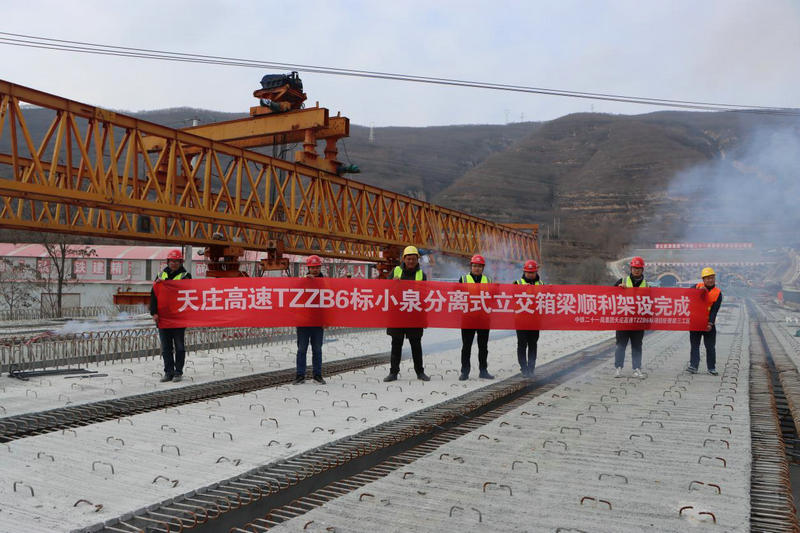 中鐵二十一局四公司天莊高速公路項目部承建的小泉分離式立交全長97m,上部結構采用3*30m裝配式預應力混凝土箱梁,共計24榀;下部結構采用鉆孔灌注樁基礎,圓柱式橋墩,橋臺采用肋板臺。自架梁施工以來,項目部克服了下穿10KV和35KV兩處民用高壓線,上跨G566國道,運、架梁安全風險系數高等一系列困難,特別是近期抗擊疫情期間,項目部采取有效措施積極做好疫情防控工作,科學有序組織現場施工生產,實現了“兩手抓、兩不誤”,圓滿完成了小泉分離式立交箱梁架設施工任務,為下一步橋面系施工提供了工作面,確保了節(jié)點工期。