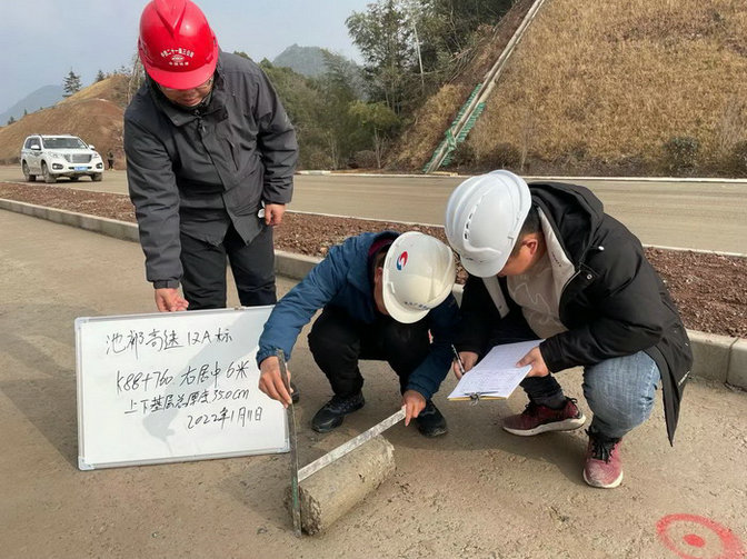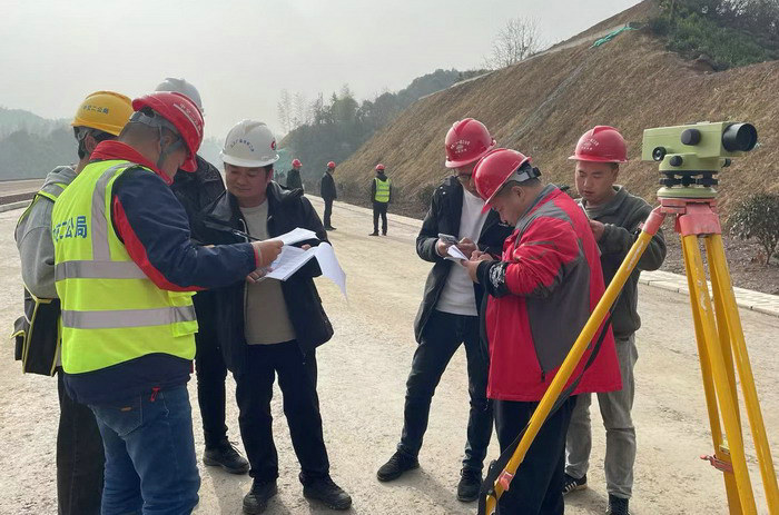 圖為現(xiàn)場高程測量驗收在交驗現(xiàn)場,池祁高速項目辦、駐地辦監(jiān)理、第三方檢測等人員共同監(jiān)督指導(dǎo),見證交驗過程。
