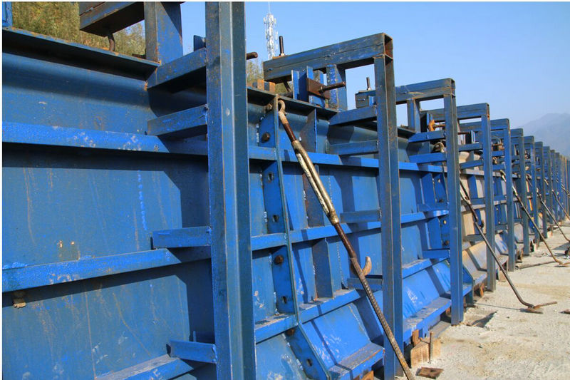 為保證新澤西墻的建筑質(zhì)量,施工中在完成基礎(chǔ)調(diào)平后,分別根據(jù)直線和曲線每隔5米、2.5米進(jìn)行放樣,并做好標(biāo)記。鋼筋綁扎過程中,使用自制的鋼筋定位卡,對(duì)所有的經(jīng)緯鋼筋進(jìn)行規(guī)范定位,保證鋼筋橫平豎直,間隔相同。調(diào)平層立模確保模板內(nèi)側(cè)邊緣與放樣的墨線位置重合,加固時(shí)采用內(nèi)撐外拉的方式,同步進(jìn)行高程測(cè)量,確保模板位置正確、接縫嚴(yán)密?;炷翝仓^程中每隔10米至12米留置伸縮縫,伸縮縫留置與防撞護(hù)欄伸縮縫一致。