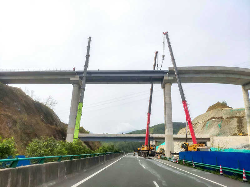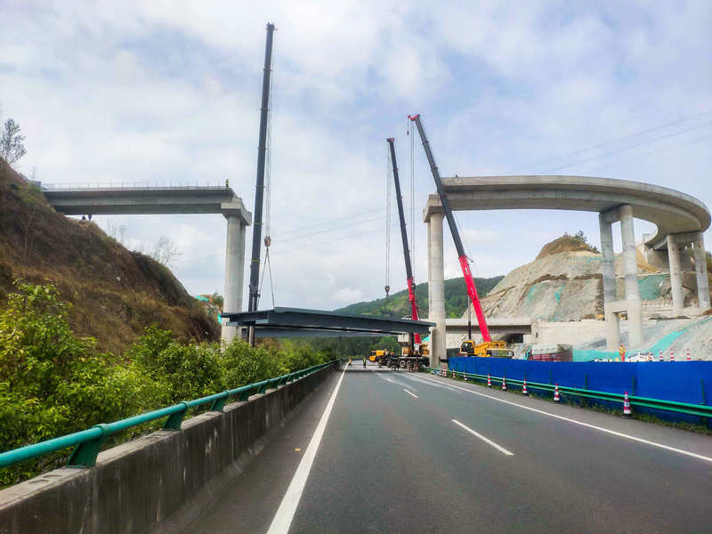 此次鋼箱梁架設(shè)需上跨蘭海高速(廣甘段)主干道施工,時(shí)間緊、任務(wù)重,梁體垂直提升高度近30米,是該項(xiàng)目最后一處“危大”工程。為確保箱梁安全精準(zhǔn)架設(shè),該項(xiàng)目成立攻堅(jiān)團(tuán)隊(duì),深入現(xiàn)場(chǎng)調(diào)查研究,多次組織召開專題會(huì)議,優(yōu)化吊裝方案,認(rèn)真做好施工前的技術(shù)交底,使作業(yè)人員能熟練掌握技術(shù)規(guī)程和操作規(guī)范。同時(shí),搶抓作業(yè)有利窗口期,將蘭海高速(廣甘段)道路車輛分流至在建廣平高速匝道繞行,采用3臺(tái)吊車同時(shí)協(xié)作施工,經(jīng)過11個(gè)小時(shí)的緊張作業(yè),“落梁”作業(yè)圓滿完成。