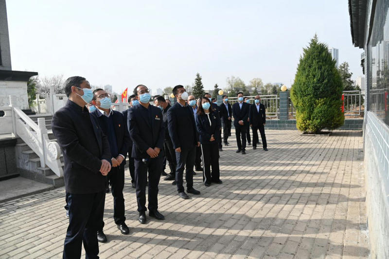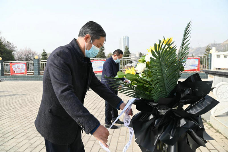 春日的烈士陵園內(nèi),翠柏青青,蒼松肅立,氣氛莊嚴肅穆,革命烈士紀念碑巍然屹立,“革命烈士永垂不朽”八個鎏金大字格外醒目。在公祭革命烈士紀念碑儀式中,全體人員列隊行注目禮,奏唱國歌后,全場肅立,向革命烈士紀念碑三鞠躬。伴著莊嚴肅穆的獻花曲,柳倉太、祁濤緩步上前,仔細整理花籃緞帶,并將花籃敬獻于紀念碑基座前。隨后,大家依次繞行,瞻仰革命烈士紀念碑和烈士英名紀念墻,全體人員紛紛敬獻鮮花。