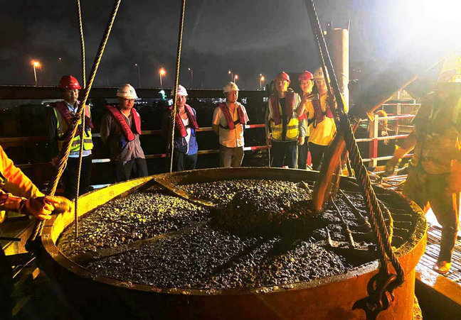濱?;ネ⒔辉O(shè)計(jì)樁基1033根,去年變更后為 1027根,插入海底的樁基直徑1.8—2.5米、深度平均83米。D匝道位于濱?;ネ▋?nèi)環(huán)區(qū)域,畫了一個(gè)圓圈,與幾條匝道縱橫交錯(cuò)。H匝道在濱?;ネㄍ猸h(huán),與著名的寧波—舟山跨海21000米的金塘大橋相接。D、H匝道橋設(shè)計(jì)樁基81根,其中H匝道樁基是8條匝道中最少的。今年春節(jié)前,全長(zhǎng)4510米的濱海高架橋、主跨135米的連續(xù)梁主體工程相繼完工,之后該項(xiàng)目部將施工重點(diǎn)集中在濱?;ネ?,采取鋼棧橋架設(shè)與主線橋和匝道橋樁基、承臺(tái)、墩身全面推進(jìn)的施工策略,打好2022年關(guān)鍵之年攻堅(jiān)戰(zhàn)。樁基施工是橋墩作業(yè)的第一道工序,也是第一道關(guān),不能有絲毫馬虎。振插鋼護(hù)筒時(shí),在技術(shù)人員指導(dǎo)下進(jìn)行,做到不偏不倚,以泰山壓頂、排山倒海之勢(shì),將一根根焊接成83米的鋼護(hù)筒,一點(diǎn)一點(diǎn)地往下插。由于海底結(jié)構(gòu)復(fù)雜,地質(zhì)不確定因素多,常遇到堅(jiān)硬的泥巖、砂巖,此時(shí)馬上啟用大功率、振插力達(dá)到上百噸的振動(dòng)錘,在履帶吊的配合下進(jìn)行作業(yè),直至將鋼護(hù)筒插到位。在后續(xù)鉆孔泥漿反循環(huán)和吊裝鋼筋籠作業(yè)時(shí),吊車和人力通力合作,掏空鋼護(hù)筒內(nèi)的泥漿后,將鋼筋籠穩(wěn)穩(wěn)地下到海底深處。灌樁時(shí)間大部分是晚上,由幾名技術(shù)員在場(chǎng)指導(dǎo)施工,在監(jiān)理和業(yè)主單位工程師見(jiàn)證下順利完成。