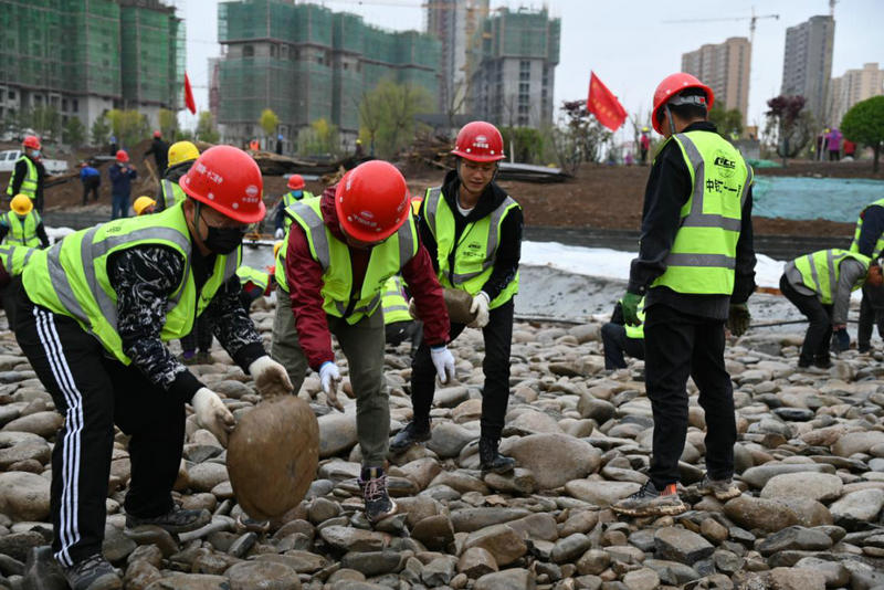 活動中,指揮部成立黨員突擊隊,黨員干部沖在前線,臨夏工程公司及各項目班子成員率先垂范,邊示范、邊指導,走進職工和勞務人員的隊伍當中,與他們一起參與湖底卵石鋪筑,充分發(fā)揮了黨員模范先鋒作用。從清晨一場突如其來的雨夾雪到正午的烈日暖陽再到傍晚的涼風習習,全體干部職工在黨組織的帶領下,不怕苦、不怕累,你拉我一把、我扶他一下,團結(jié)協(xié)作,圓滿完成義務勞動。