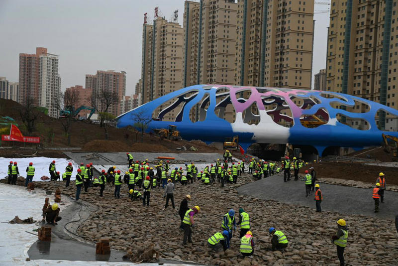 為確保牡丹公園項目優(yōu)質(zhì)高效完成施工任務,保證五一具備開園條件,早晨7點,臨夏工程公司及所屬各項目干部職工及勞務人員300余人組成18個隊伍,齊聚項目施工現(xiàn)場,開展全員義務勞動活動,對牡丹公園東西兩側(cè)人工湖進行湖底卵石鋪筑,場區(qū)生活垃圾清理,樓梯踏步清理、修整、鋪磚,駁岸邊坡嵌石等工作。項目原有施工隊伍對橋面裝修,玻璃棧道鋼柱安裝、砼包封施工,混凝土澆筑,大循環(huán)管道開挖、焊接、埋設及回填等工作面正常推進。近30個工作面同時作業(yè),工地現(xiàn)場機器聲轟鳴,工程車穿梭,一幅熱火朝天的大干場面。