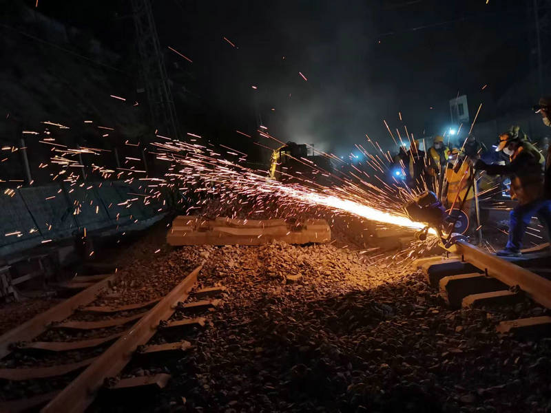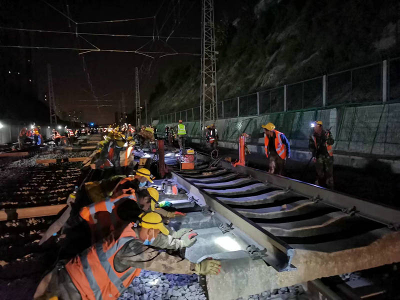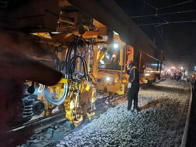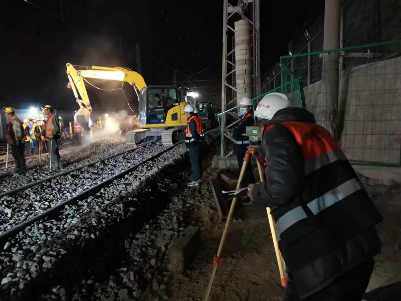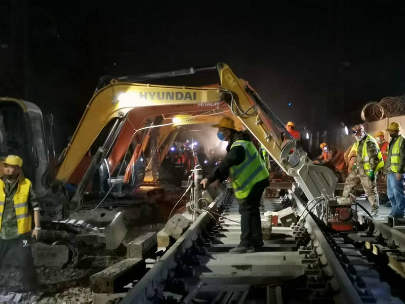 施工前安全負責人對參與既有線施工人員進行了班前教育,對各類工機具進行了清點登記。0點05分,車站調(diào)度施工命令下達后,由施工總指揮下達進網(wǎng)施工指示,現(xiàn)場施工人員嚴格按照方案及交底有序開展施工,拆除防護柵欄300米,掛設回流線、切斷既有線路81.5米鋼軌滑出軌排、新預鋪的155#道岔縱向移動30米,道岔橫移落位、上渣整道、大機搗固、工電聯(lián)調(diào)等工序有條不紊地開展。每道工序精準銜接、快速有序、準確無誤。經(jīng)過250分鐘奮戰(zhàn),在參戰(zhàn)人員的集體努力下,順利完成了施工任務。