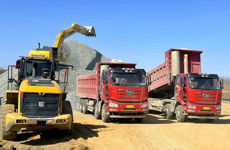 北黑鐵路K261+600至K272+500的10.9公里既有線路基段,需要路基加寬、邊坡護(hù)砌、修筑排水溝等改造施工,為九月初線路封鎖創(chuàng)造條件。節(jié)日期間,工人們正在進(jìn)行路基高填方施工,35臺(tái)重型翻斗車(chē)正源源不斷地?fù)屵\(yùn)土方,推土機(jī)、壓路機(jī)配合攤平碾壓,