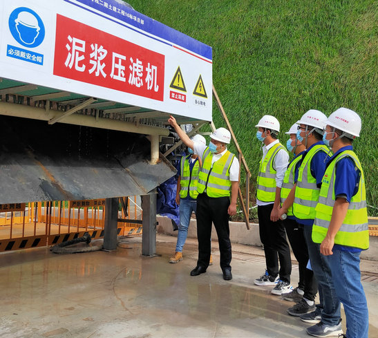 曹元均(左1)與技術(shù)人員探討泥漿壓濾機(jī)原理