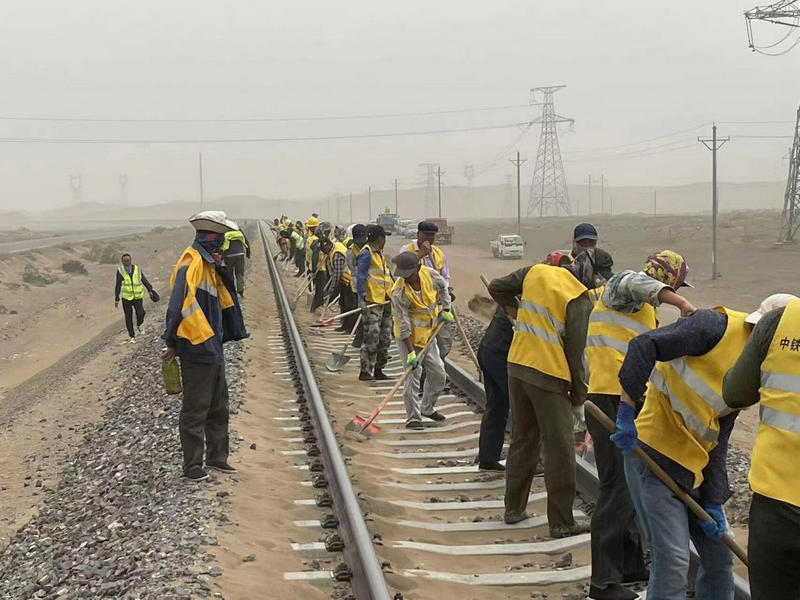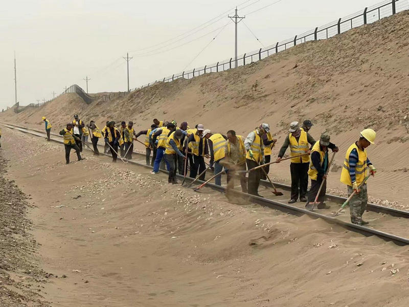 搶險(xiǎn)隊(duì)伍聽(tīng)從指揮,一字排開(kāi),用最快的節(jié)奏揮舞著鐵鍬,一鍬一鍬地將沙子揚(yáng)到線路2米以外,展開(kāi)緊張有序的搶險(xiǎn)施工作業(yè)。有的路基高達(dá)5米,搶險(xiǎn)隊(duì)伍被風(fēng)吹的東倒西歪,揚(yáng)沙被大風(fēng)吹散,線路上瞬間沙塵漫天,沙浪一波接著一波地襲來(lái),砂粒打在人臉上生疼。盡管嘴里、頭發(fā)里都是沙子,但大家揮舞鐵鍬的動(dòng)作從未間斷。