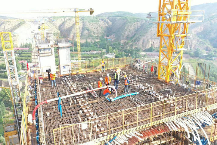 6月2日7點58分,在鞭炮聲和機械的轟鳴聲中,第一輛混凝土運輸車緩緩開進現(xiàn)場,開啟的地泵源源不斷將混凝土輸送到高處的任灣茹河特大橋右幅11#主墩0號塊,標志著中鐵二十一局銀昆高速公路LJ12-2標任灣茹河特大橋首個0號塊混凝土開始澆筑,橋梁上部結構施工正式拉開帷幕。