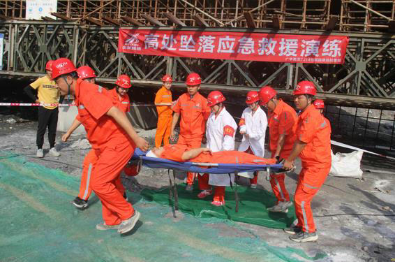 通過模擬高空作業(yè)人員在高架橋面系施工過程中墜落受傷的場景,展示了從發(fā)現(xiàn)傷員、通知事故情況、啟動緊急預(yù)案、組織應(yīng)急救援小組展開施救到后期處理的全部環(huán)節(jié)。過程中,搶險救援組、醫(yī)療救護(hù)組、警戒保衛(wèi)組等小組對應(yīng)急救援處置程序、方法和注意事項(xiàng)等進(jìn)行了詳細(xì)演示和說明,大家各盡其職、行動有序,整個演練過程忙而不亂,完整有序,達(dá)到了預(yù)期目的。
