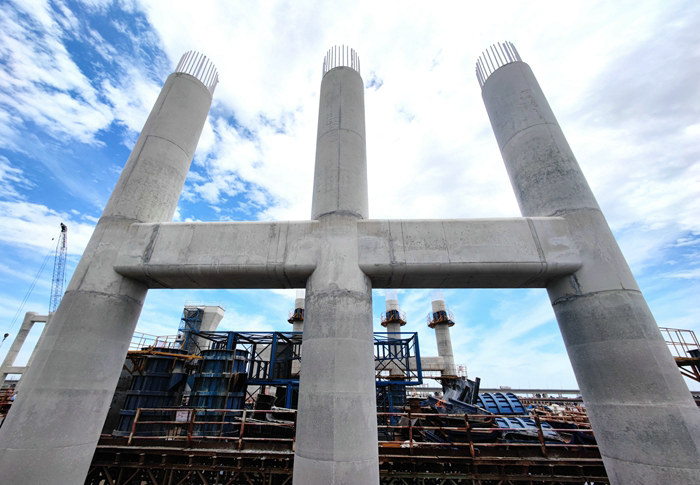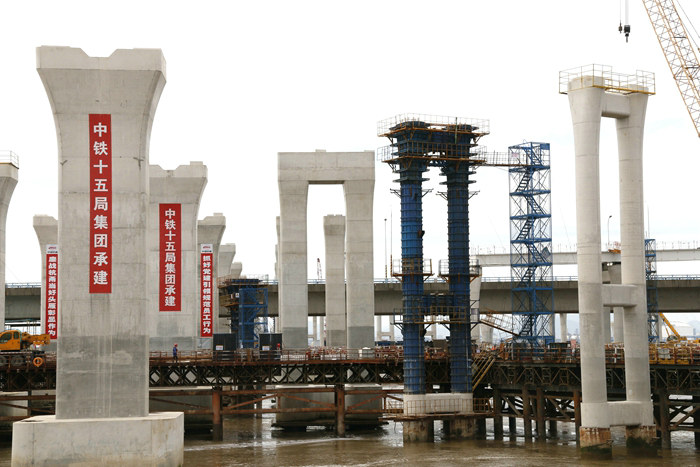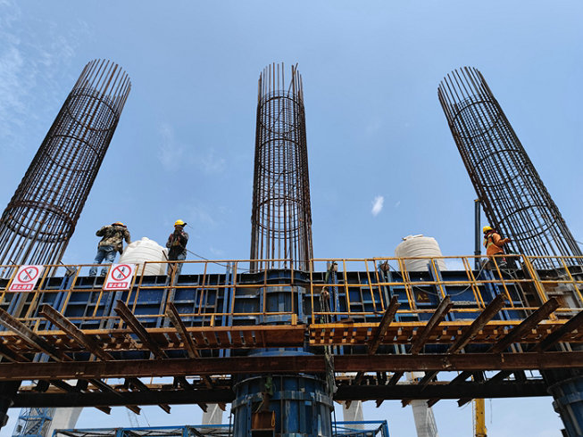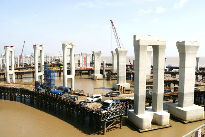 濱?;ネüて?個(gè)月,時(shí)間緊、任務(wù)重、安全風(fēng)險(xiǎn)大。該項(xiàng)目部在先期完成濱海高架主體之后,去年以來采取鋼棧橋、作業(yè)平臺、樁基、承臺、橋墩、架梁等6道工序流水作業(yè)的辦法,各自為戰(zhàn)與通力合作相結(jié)合。為防止在材料調(diào)配、設(shè)備移動(dòng)、吊裝、泥漿和破樁頭混凝土塊外運(yùn)過程中相互干擾,給施工造成影響,該項(xiàng)目部在現(xiàn)場有專人指揮協(xié)調(diào),疏通海上道路,提供快捷的大通道。G匝道樁基、承臺的陸續(xù)矗立海水中,為橋墩施工做了很好的鋪墊。