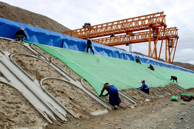 由于項目地處海拔4000米的高原河谷地帶,植被稀疏,風沙大,生態(tài)環(huán)境極度薄弱。為保護環(huán)境減少揚塵,項目部在完成邊坡骨架防護工作后,聘用當?shù)夭刈迦罕娭膊菰曰ā檫m應(yīng)當?shù)丨h(huán)境氣候,特意選用格?;ㄅc黑麥草進行混合播種,項目部在播撒草籽后用防塵蓋土網(wǎng)覆蓋,并安排水車每天灑水一次,確保草種順利發(fā)芽。