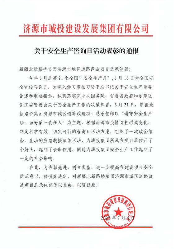 7月5日,北新路橋集團西安分公司濟源市政工程項目部收到業(yè)主方濟源市城投建設(shè)發(fā)展集團有限公司表揚信。