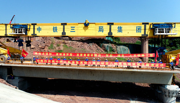 7月10日上午,位于宜賓市的中鐵三局渝昆高鐵站前六標(biāo)架梁施工現(xiàn)場,在39度的高溫天氣下,隨著指揮人員一聲令下,首榀長達(dá)32米、重達(dá)800噸的雙線箱梁穩(wěn)穩(wěn)地架設(shè)在李家村3號大橋3#-4#橋墩上,拉開了渝昆六標(biāo)箱梁架設(shè)序幕,正式開啟“架梁模式”。
