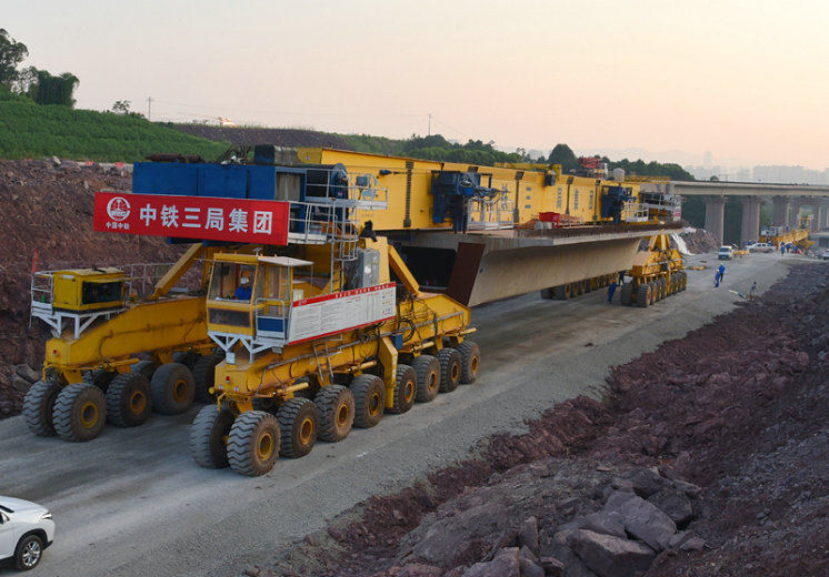 中鐵三局線橋公司承擔(dān)標(biāo)段內(nèi)36座橋梁381孔箱梁的架設(shè)施工任務(wù),為確保施工任務(wù)順利進(jìn)行,項目部統(tǒng)籌部署,緊緊圍繞架梁工期節(jié)點安排施工計劃,全面優(yōu)化施工組織方案,嚴(yán)格落實業(yè)主西昆有限公司相關(guān)要求,堅決按照標(biāo)準(zhǔn)化管理及質(zhì)量安全紅線管理,面對工期緊、交叉作業(yè)多、地質(zhì)條件復(fù)雜、大坡道架梁等多重不利因素,項目部積極應(yīng)對,結(jié)合現(xiàn)場實際,采用WE-SC900H運(yùn)架一體機(jī)施工,此型架橋機(jī)采用提梁、運(yùn)梁、架設(shè)三合一的設(shè)計模式,針對首榀箱梁架設(shè)伴隨25‰大坡道,項目部對安全質(zhì)量卡控要點做了專項培訓(xùn),并對施工人員進(jìn)行技術(shù)交底,讓每一位施工人員明確施工步驟、技術(shù)要求。架梁過程中,領(lǐng)導(dǎo)全程跟班盯控,作業(yè)隊人員嚴(yán)格堅守各自崗位,嚴(yán)密監(jiān)控每一個環(huán)節(jié),即使汗水浸透了衣服,也毫不懈怠,為首梁的成功架設(shè)提供了強(qiáng)有力保障。