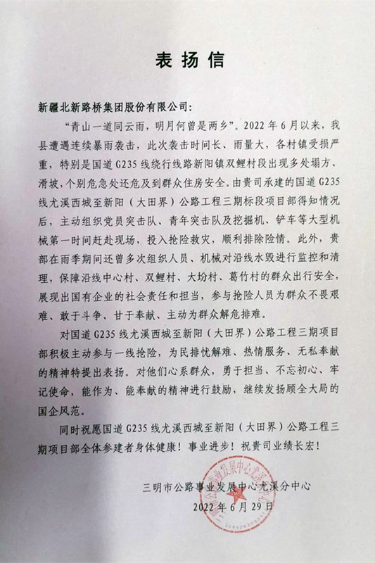 尤溪訊(通訊員 劉小波)近日,北新路橋集團(tuán)長(zhǎng)沙分公司國(guó)道G235線尤溪西城至新陽(大田界)公路工程三期項(xiàng)目部收到來自福建省三明市公路事業(yè)發(fā)展中心尤溪分中心的表揚(yáng)信,表揚(yáng)該項(xiàng)目部在6月份暴雨襲擊尤溪縣時(shí),用行動(dòng)彰顯責(zé)任、用擔(dān)當(dāng)詮釋使命,敢作為、能奉獻(xiàn)、顧大局的精神。