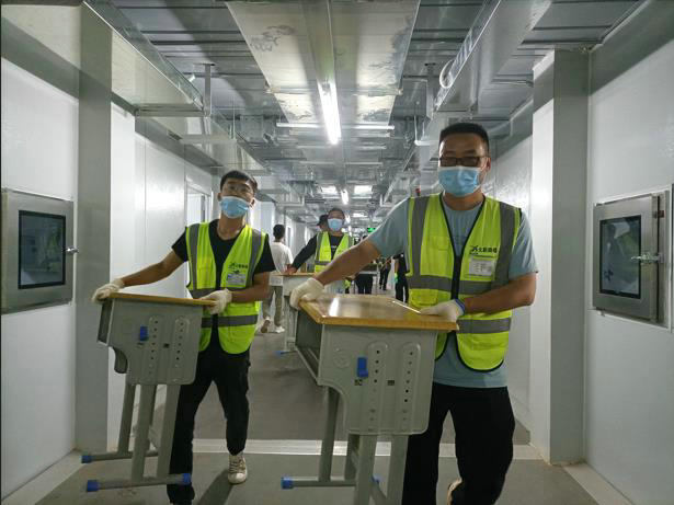 在接收到屬地方艙醫(yī)院人手“告急”的消息后,該項(xiàng)目迅速集結(jié)黨員青年志愿者趕赴現(xiàn)場,主動(dòng)配合、積極作為、分工協(xié)作,搬運(yùn)桌椅、清理垃圾、掃地拖地……。在大家的通力協(xié)作下,“戰(zhàn)斗”一直持續(xù)一天,圓滿完成了方艙醫(yī)院兩層200多個(gè)房間的清掃整理任務(wù)。