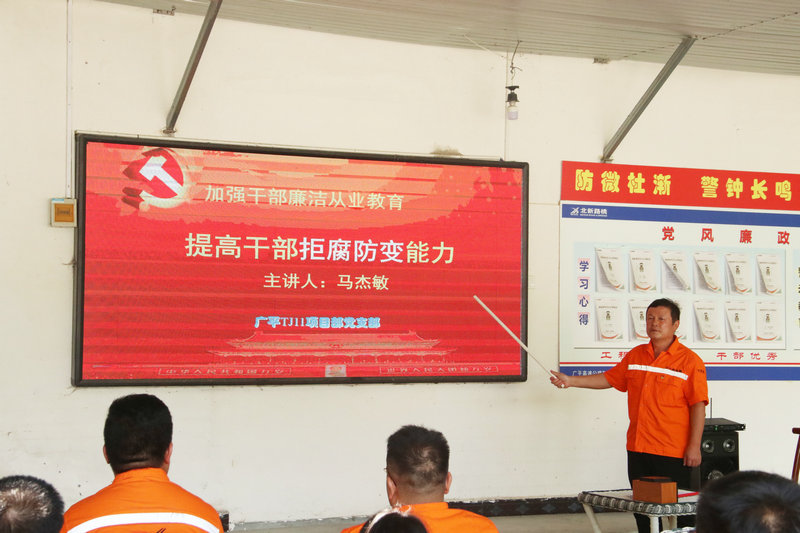 鐵路工程建設(shè)網(wǎng)訊(通訊員 劉宇奇)為進(jìn)一步落實(shí)黨風(fēng)廉政建設(shè)主體責(zé)任和監(jiān)督責(zé)任,持續(xù)推進(jìn)作風(fēng)建設(shè),達(dá)到“以月促年”的效應(yīng),廣平高速公路TJ11合同段通過(guò)組織開(kāi)展警示教育、廉政黨課、紀(jì)法知識(shí)答題等宣教活動(dòng),不斷提高黨員干部行為準(zhǔn)則,深化拓展黨風(fēng)廉政建設(shè)“教育鏈”,扎實(shí)推進(jìn)“廉政月”主題教育活動(dòng),唱響黨風(fēng)廉政建設(shè)“好聲音”。