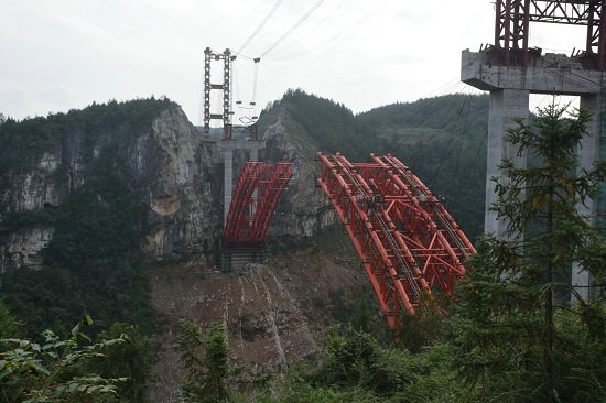 由于橋址區(qū)屬構(gòu)造溶蝕侵蝕低山丘陵地貌區(qū),深切割“V”峽谷斜(陡)地形,斜坡坡度較大,兩岸地形陡峭,局部近似直立狀,地形起伏較大,大橋施工環(huán)境極其險惡。大橋軸線經(jīng)過地段地面標(biāo)高在510~693m之間,相對高差約183米。本橋橫跨找龍壩河,河流整體呈東西走向,河谷底部寬約20米,頂部寬約230米,河谷兩岸坡面上植被較發(fā)育,多為喬木、灌木。施工難度相當(dāng)大,工期十分緊,是全線的卡控點工程。自2017年5月開工以來,項目部克服諸多困難,做好施工方案評審及優(yōu)化、纜索吊機安裝及測試、首節(jié)段驗收等各項工作,施工現(xiàn)場如火如荼,科學(xué)組織,緊張有序向前推進。今年4月30日完成主拱肋的首節(jié)段吊裝,目前吊裝施工有條不紊地進行,為深山峽谷施工積累了豐富經(jīng)驗。