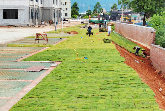 圖為工人正在鋪設(shè)該項(xiàng)目綠化草皮(安飛妃攝)