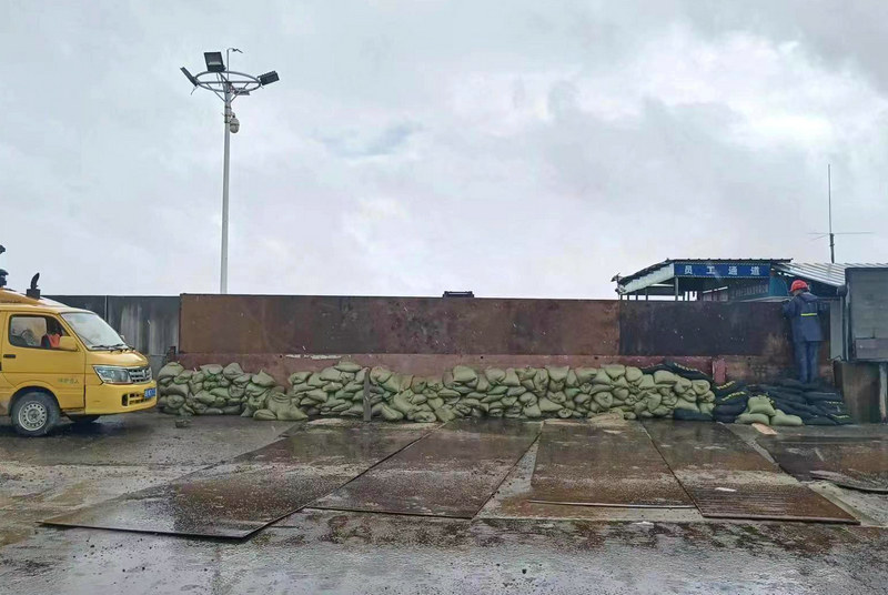 為加強(qiáng)臺(tái)風(fēng)“軒嵐諾”登陸寧波海域期間的安全管理,杭甬項(xiàng)目主要領(lǐng)導(dǎo)前往濱?;ネüさ夭榭纯古_(tái)防御情況,發(fā)現(xiàn)海上漫上棧橋,在車(chē)輛、員工出入濱?;ネüさ氐?號(hào)棧橋口,由工字鋼架、鋼板、沙袋構(gòu)成的擋水墻高度,難以抵御大浪的侵襲,有突破防線的可能,當(dāng)務(wù)之急是加高擋水墻。該項(xiàng)目部迅速組織搶險(xiǎn)車(chē)輛,將鋼板、工字鋼和沙袋運(yùn)至出入口,由多名電焊工進(jìn)行緊張有序的切割、焊接加工。經(jīng)過(guò)兩個(gè)多小時(shí)的緊張施工,工字鋼架和鋼板的高度由原1.2米增加至2.5米。同時(shí)在鋼板外側(cè)堆碼200多個(gè)沙袋,防止海水從底部涌出,也增加了鋼結(jié)構(gòu)擋水墻的安全系數(shù)。