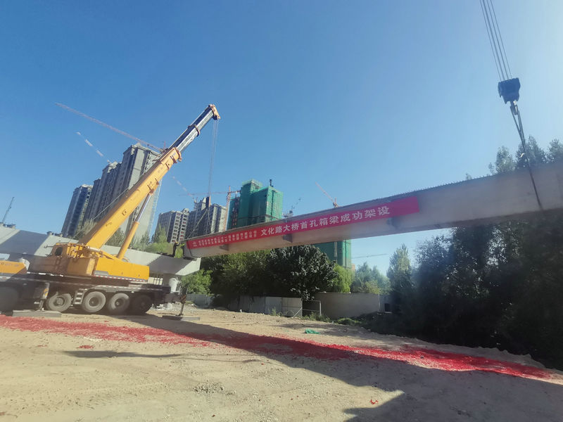 此次架設(shè)部位為文化路大橋3#墩~6#墩,共需架設(shè)箱梁30片,單片箱梁為預(yù)應(yīng)力箱梁,長(zhǎng)30米,邊梁寬2.85米,中梁寬2.4米,重100噸,采用300噸和130噸汽車吊各一臺(tái)同時(shí)順利吊裝架設(shè),為后續(xù)架梁施工及上部結(jié)構(gòu)施工奠定了堅(jiān)實(shí)基礎(chǔ)。