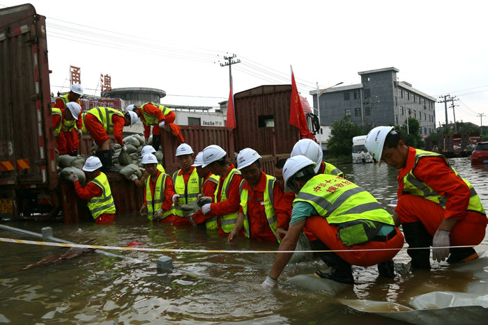 同時,項目黨支部充分發(fā)揮戰(zhàn)斗堡壘作用,在鎮(zhèn)海、海曙區(qū)政府和駐地群眾需要時,踐行央企責(zé)任。2021年7月“煙花”和9月“燦都”兩次臺風(fēng)途徑寧波,項目黨支部積極組織黨員提前做好預(yù)防,加固無法撤離的設(shè)備,轉(zhuǎn)移安置上千名員工。在臺風(fēng)來襲過程中和臺風(fēng)過后,由19名黨員帶頭、普通員工參加的搶險突擊隊,冒著狂風(fēng)暴雨奔赴石化區(qū)加固防洪堤壩,堆碼沙袋1公里,遏制了海水侵襲。當(dāng)古林鎮(zhèn)一片汪洋,10萬名群眾生產(chǎn)、生活被洪水圍困之時,該項目由黨員領(lǐng)銜的突擊隊出現(xiàn)在古林街頭,在齊腰深的洪水中用沙袋將涌水擋在高墻外,保護了群眾的生命安全,寧波市交通局、鎮(zhèn)海石化區(qū)管委會、古林鎮(zhèn)等多家政府部門送來錦旗和表揚信。