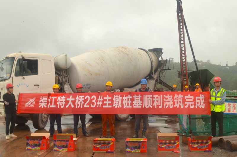 10月5日上午,隨著最后一車混泥土的澆筑,由北新路橋集團(tuán)北新融建公司承建的重慶雙錢高速公路土建施工SQTJ1標(biāo)段渠江特大橋23#主墩樁基順利澆筑完成,標(biāo)志著渠江特大橋東岸主墩樁基全部完成澆筑,東岸順利完成第一道工序,下一步將有序推進(jìn)圍堰及承臺基坑施工。