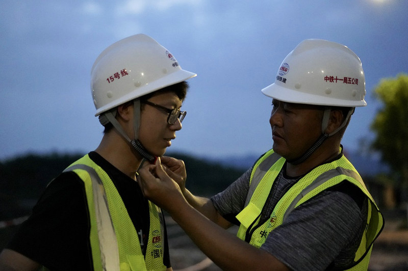 張盛偉(右)給大學(xué)實(shí)習(xí)生調(diào)整安全帽帶