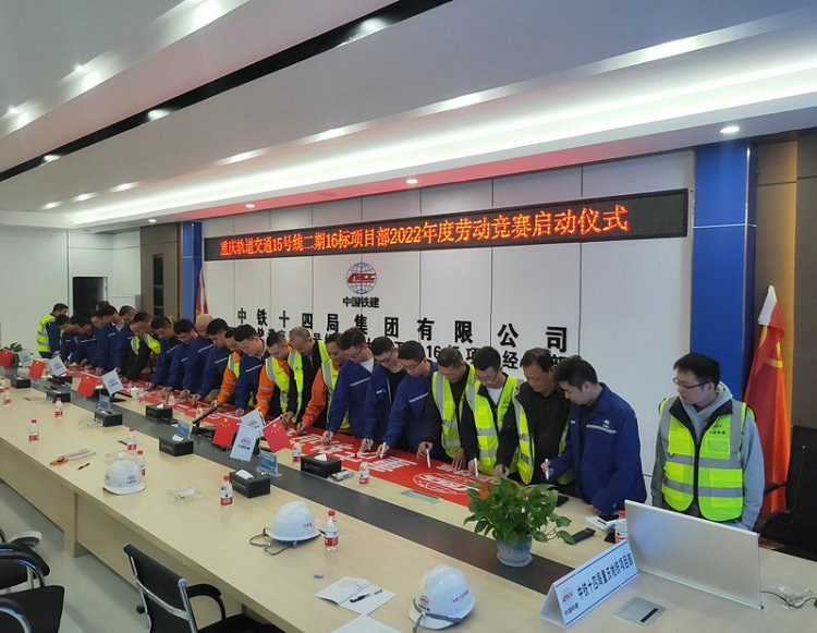11月1日,中國(guó)鐵建重慶投資集團(tuán)軌道交通15號(hào)線二期總承包部16標(biāo)14局項(xiàng)目部召開(kāi)“奮戰(zhàn)60天,決勝2022年”勞動(dòng)競(jìng)賽啟動(dòng)儀式推進(jìn)會(huì),項(xiàng)目部副部長(zhǎng)及以上人員和各工區(qū)代表40余人參加。