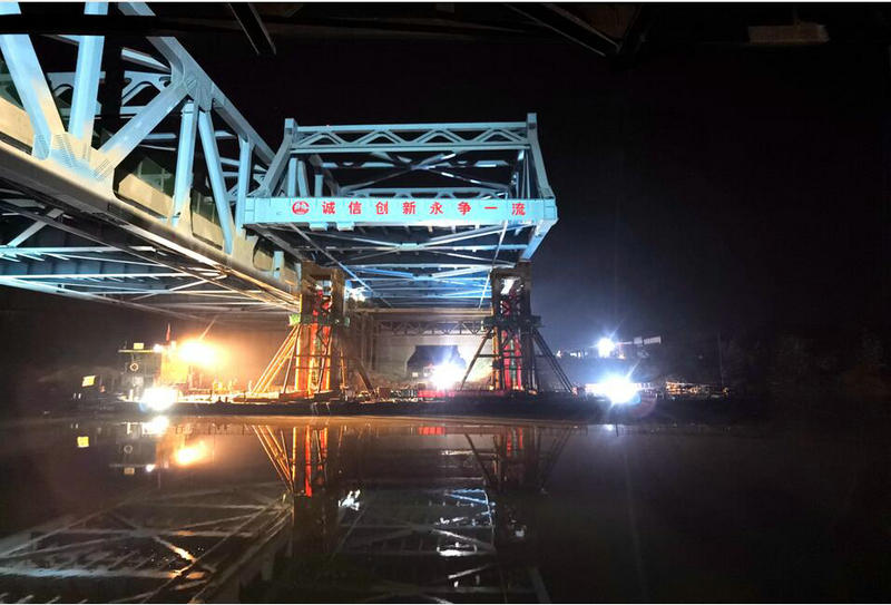 在近16個小時的連續(xù)奮戰(zhàn)中,項目領(lǐng)導(dǎo)班子全程帶班盯控,精心組織、合理安排,現(xiàn)場技術(shù)、測量人員聯(lián)合應(yīng)力應(yīng)變監(jiān)控單位同步進(jìn)行監(jiān)控量測,根據(jù)實時參數(shù)變化隨時進(jìn)行糾偏,對每個環(huán)節(jié)、每個施工點安排專人晝夜值守,克服了鋼桁梁重量大、浮墩支架高、水中拖拉平穩(wěn)性控制難、水位變化大等不利因素,全過程監(jiān)督排查安全隱患,確保了浮拖過河施工安全有序進(jìn)行。