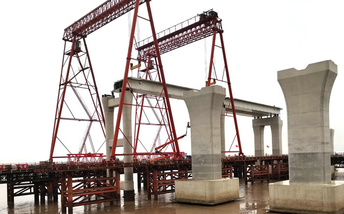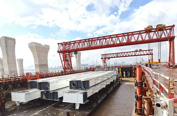 杭甬項(xiàng)目濱?;ネㄆ磳挊蚝?座匝道橋設(shè)計(jì)鋼箱梁493片,其中疊合梁297片,全部在舟山長(zhǎng)虹鋼結(jié)構(gòu)有限公司生產(chǎn)。疊合梁是由裸梁經(jīng)過(guò)再加工而成的。疊合梁厚度一樣,寬度不等,長(zhǎng)度在20米到60米之間,最重達(dá)170噸。由于前期在濱?;ネńǔ尚读赫竞吞崃赫?,復(fù)雜的審批手續(xù)履行完畢,告別通過(guò)石化區(qū)碼頭卸裝和長(zhǎng)途車(chē)輛運(yùn)輸費(fèi)時(shí)費(fèi)力、成本高的歷史,于10月25日正式投入使用,裝著6片鋼箱梁的貨船駛進(jìn)卸梁站。通航的順利進(jìn)行,為后面運(yùn)梁、卸梁、安裝梁躺平了道路。由于運(yùn)輸重型梁的條件具備,該項(xiàng)目從舟山將疊合梁裝上千噸級(jí)貨船,在海上航行數(shù)小時(shí)抵達(dá)濱海互通,在有關(guān)人員操控下,利用卸梁站、提梁站、卸貨平臺(tái)和4臺(tái)龍門(mén)吊、2臺(tái)履帶吊,采取提卸、裝運(yùn)、架設(shè)一條龍施工模式,加快了施工進(jìn)度。之前,為了確保各工序運(yùn)作過(guò)程的科學(xué)合理,項(xiàng)目部編制了便于操作的可行性施工方案,經(jīng)海事、業(yè)主有關(guān)專(zhuān)家對(duì)方案的評(píng)審認(rèn)定,付諸實(shí)施。在安全管控上,項(xiàng)目部高度重視,每天指定現(xiàn)場(chǎng)安全人員緊盯施工過(guò)程,發(fā)現(xiàn)不規(guī)范操作行為,立即叫停,在100%安全的情況下才準(zhǔn)許施工。同時(shí)加強(qiáng)對(duì)卸梁站、提梁站、運(yùn)輸車(chē)輛、履帶吊等特種設(shè)備的安全檢測(cè),不放過(guò)一個(gè)疑點(diǎn),不給事故留下安全隱患。
