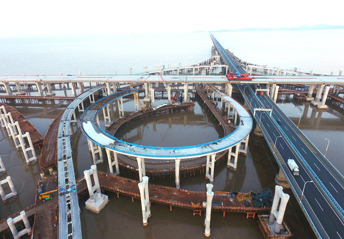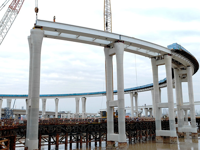 杭甬復(fù)線濱海高架橋最后一座“堡壘”,也是全線海上唯一一座連續(xù)梁,于2021年12月25日成功合攏之后,該項目濱?;ネㄖ骶€橋、拼寬橋、匝道橋成為2022年施工的主戰(zhàn)場,他們在兩次超強臺風(fēng)導(dǎo)致工期緊和新冠疫情防控形勢嚴(yán)峻的壓力下,截止12月上旬,一個個節(jié)點相繼突破,圓滿完成均長98米的1027根樁基和主線橋、拼寬橋、8座匝道橋170座承臺,完成7座匝道橋318座墩柱,建成1座卸梁站、2座提梁站,架設(shè)20米—30米的鋼箱梁124片,目前主要工程量是承臺、墩柱收尾和制梁、運梁、架梁及橋面板施工。