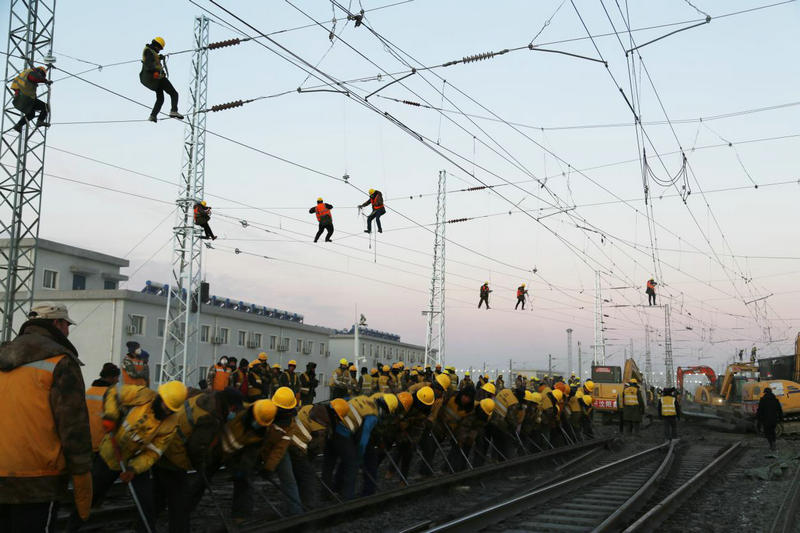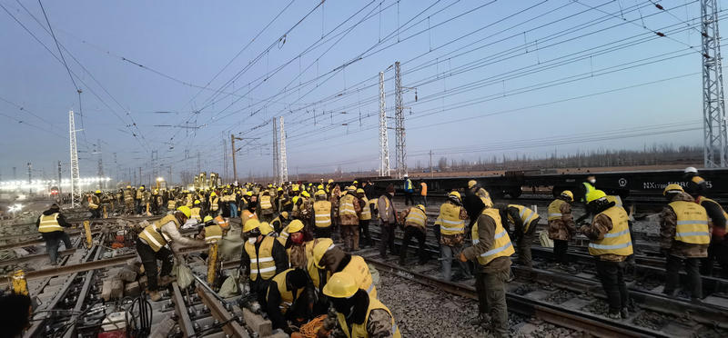 12月27日,400余名工人冒著零下17度的嚴寒經(jīng)過連續(xù)8.5小時的鐵路二級封鎖施工,成功拆除既有道岔6組,線路59.43米,插入道岔5組,補充軌排46.16米,同步哈密東Ⅱ場(駝峰尾部)、Ⅲ場(上行出發(fā)場)新增信號設(shè)備安裝調(diào)試,室內(nèi)外配線拆改,新聯(lián)鎖、CTC軟件更換及聯(lián)鎖試驗,軋道試驗、改方、場聯(lián)試驗;調(diào)度所局中心服務(wù)器數(shù)據(jù)修改,完成哈密東Ⅲ場接觸網(wǎng)接觸懸掛撥移、過渡、調(diào)整,哈密東Ⅱ、Ⅲ場聯(lián)絡(luò)線Ⅱ-2#與Ⅱ-3#支柱間接觸網(wǎng)線索對接、分段絕緣器安裝及調(diào)試,隔開引線安裝及調(diào)整,接觸網(wǎng)熱滑試驗。標志著由中鐵二十一局集團承擔施工的哈密東站擴能改造工程順利完成。