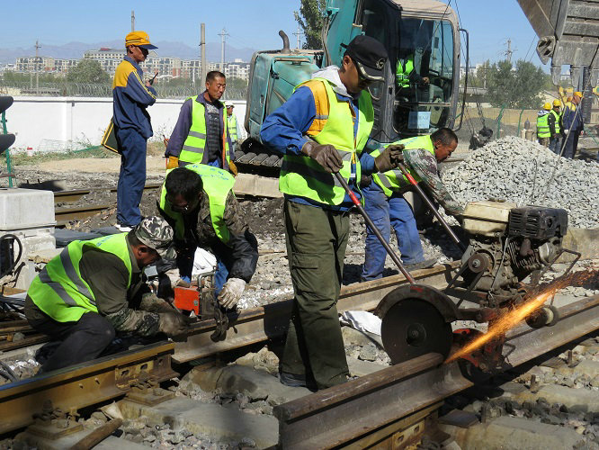 300余名施工人員在鐵路上緊張有序忙碌,黃色的身影一片火熱;十多臺大型機械轟轟隆隆,各行其道,井然有序;切割機火光四濺,一次到位,準確無誤;打眼操作彈無虛發(fā),百發(fā)百中;液壓機靈活自如。鋸軌、拆除道岔、扒砟......施工現(xiàn)場有序推進,人頭攢動,忙而不亂,紛繁有序。