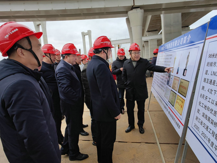 下午4點10分,王立軍帶領(lǐng)縣委常委、政法委書記于師義,縣委常委、辦公室主任張鵬,以及下屬部分局、鎮(zhèn)主管和企業(yè)家等20余人來到杭甬項目濱?;ネ?,首先聽取了常務(wù)副經(jīng)理喬繼保關(guān)于杭甬項目工程概況、安全質(zhì)量、隊伍管理、施工進(jìn)展等情況介紹。公司副總經(jīng)理兼杭甬項目負(fù)責(zé)人黃偉就項目的科技含量、科技攻關(guān)、安全跨越海底17條管線等作了補(bǔ)充,并介紹了公司近幾年生產(chǎn)經(jīng)營、實施人才戰(zhàn)略、隊伍結(jié)構(gòu)、發(fā)展前景等。隨后,王立軍等饒有興趣地觀摩了主線橋和G、E、F匝道橋高空架梁施工過程及工程質(zhì)量、安全防護(hù)等情況,并觀賞了由企業(yè)簡介和多幅濱?;ネ?、濱海高架施工圖片組成的6塊展板。許多人舉起手機(jī)對準(zhǔn)橋墩或者橋梁拍照。王立軍說:“這次到中鐵十五局杭甬項目參觀學(xué)習(xí),耳聞不如一見。十五局名不虛傳,有很強(qiáng)的實力,這么大的海上項目,從橋墩到橋梁,施工質(zhì)量稱得上是精品,我要把你們的經(jīng)驗帶回去,組織有關(guān)人員進(jìn)行研討。希望十五局參與寧陽公路、生態(tài)等領(lǐng)域的投資、建設(shè)和合作運營。