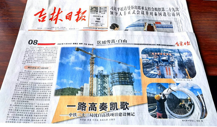 “初冬時節(jié),捷報頻傳。灣溝北站站場破土動工,中鐵二十三局沈白高鐵建設(shè)項目全線啟動;碧水奔流,聲震峽谷。灣溝特大橋、跨201國道大橋、湯河1#2#3#大橋等橋墩巍然挺立,經(jīng)受住了滔滔洪水的嚴(yán)峻考驗;施工現(xiàn)場,機聲隆隆。掌子面上工人們手持鑿巖機緊張作業(yè),不斷改寫掘進(jìn)日進(jìn)尺的最新紀(jì)錄……一條條隧道、一座座橋梁、一段段路基,穿越大山、跨過江河、橫跨村屯,講述著沈白高鐵項目建設(shè)的動人故事,展現(xiàn)著中鐵二十三局全體建設(shè)者的時代風(fēng)采。”這是長篇通訊《一路高奏凱歌》的“開場白”。