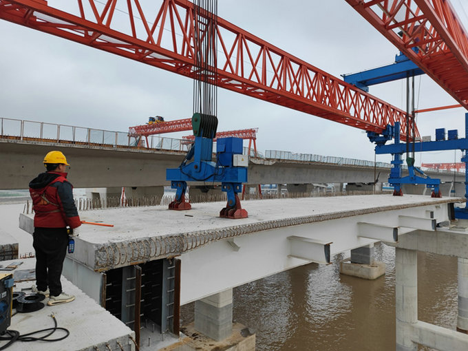 該項目濱?;ネㄊ讞l匝道——C匝道3月5日率先架通,全長467.42米、32片梁的E匝道架設(shè)完成,5條匝道累計架梁211片,以每天3——6片的速度向前延伸。該項目部在制梁、船運(yùn)、提梁、架設(shè)等方面擁有了掌控互通樞紐上部結(jié)構(gòu)施工管理和技術(shù)的經(jīng)驗,為后續(xù)架梁提速奠定了基礎(chǔ)。