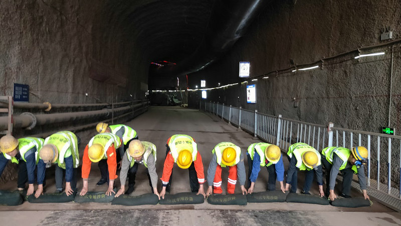 此次防洪演練模擬內(nèi)容為,中梁山隧道進(jìn)口因近期持續(xù)降雨,洞口及棄土場區(qū)水位上漲、積水增加的趨勢,隨時(shí)可能發(fā)生洪水倒灌隧道洞口,現(xiàn)場安全總監(jiān)立即向項(xiàng)目經(jīng)理報(bào)告現(xiàn)場情況,一方面開展人員撤離,另一方面組織人員堆碼沙袋、疏散警戒、人員應(yīng)急搶險(xiǎn)等模擬演練。目的是檢驗(yàn)隧道施工人員應(yīng)急響應(yīng)、現(xiàn)場搶險(xiǎn)、事故報(bào)告、應(yīng)急處置、應(yīng)急預(yù)案的可操作性和現(xiàn)場應(yīng)急處置能力。