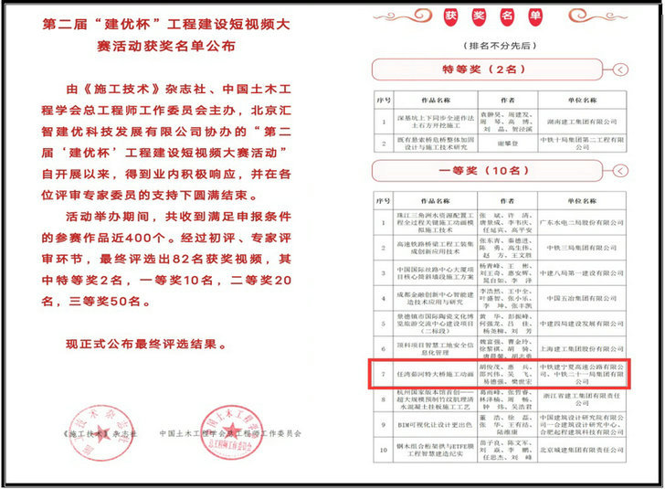 4月4日,由《施工技術(shù)》雜志社、中國土木工程學(xué)會總工程師工作委員會主辦的“第二屆‘建優(yōu)杯’工程建設(shè)短視頻大賽”結(jié)果揭曉,中鐵二十一局銀昆高速公路LJ12-2標(biāo)項目經(jīng)理部聯(lián)合業(yè)主申報的《任灣茹河特大橋施工動畫》短視頻榮獲一等獎。