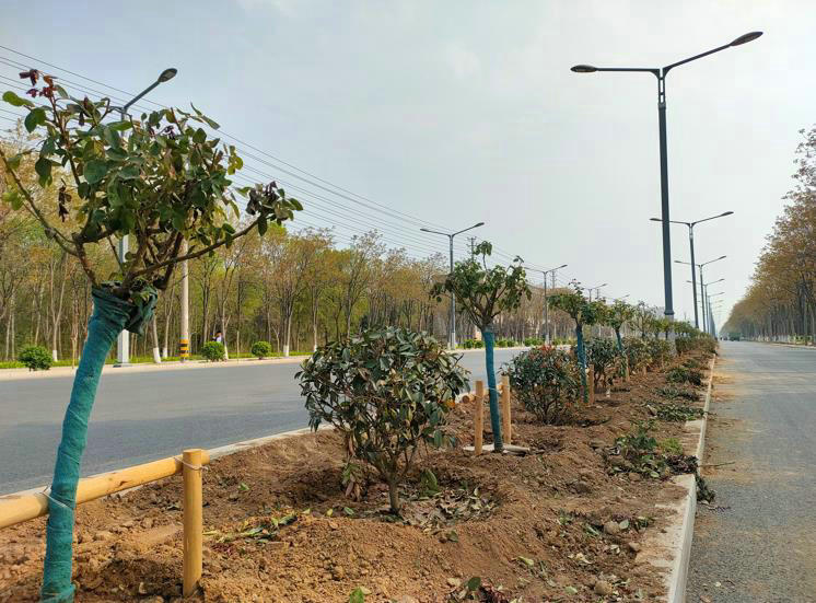 據(jù)悉,該項目濟源市黃河大道、濟源大道等主干要道的綠化施工進展迅速,駕車或步行途中,已經可以看到包括重陽木、日本晚櫻、桂花、樹狀月季等在內的多種造型樹木挺立兩旁,并搭配了海桐球、紅葉石楠等各類觀賞性灌木,預計苗木成活成蔭后,將會極大的提升濟源市容市貌、改善周邊整體人居環(huán)境。為保障施工節(jié)點盡早達成,該項目部統(tǒng)籌調度人力機械,加強了對現(xiàn)場的組織協(xié)調,遵循“美化、安全兩不誤”的綠化理念,工人們嚴格按照指揮緊張有序的開展株距測量、挖掘、移栽、保護支撐及澆灌作業(yè),各道工序穿插高效、井井有條。